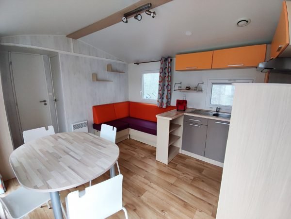 El salón con sofá convertible para dos personas, mesa de comedor con cuatro sillas fáciles de guardar!